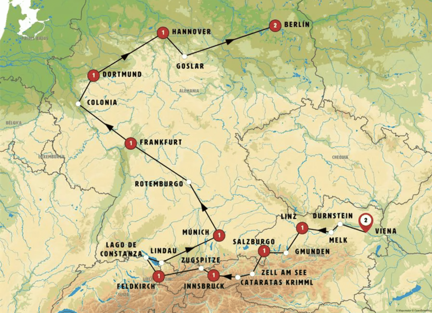 Recorrido: -> Viena 2 -> Linz 1 -> Salzburgo 1 -> Innsbruck 1 -> Feldkirch 1 -> Múnich 1 -> Frankfurt 1 -> Dortmund 1 -> Hannover 1 -> Berlín 2