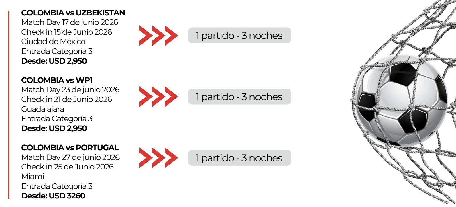 - Incluye estadía garantizada de 3 noches en hoteles seleccionados de 3 o 4 estrellas en ubicaciones privilegiadas, incluyendo la noche del partido y las dos noches anteriores en cada ciudad.