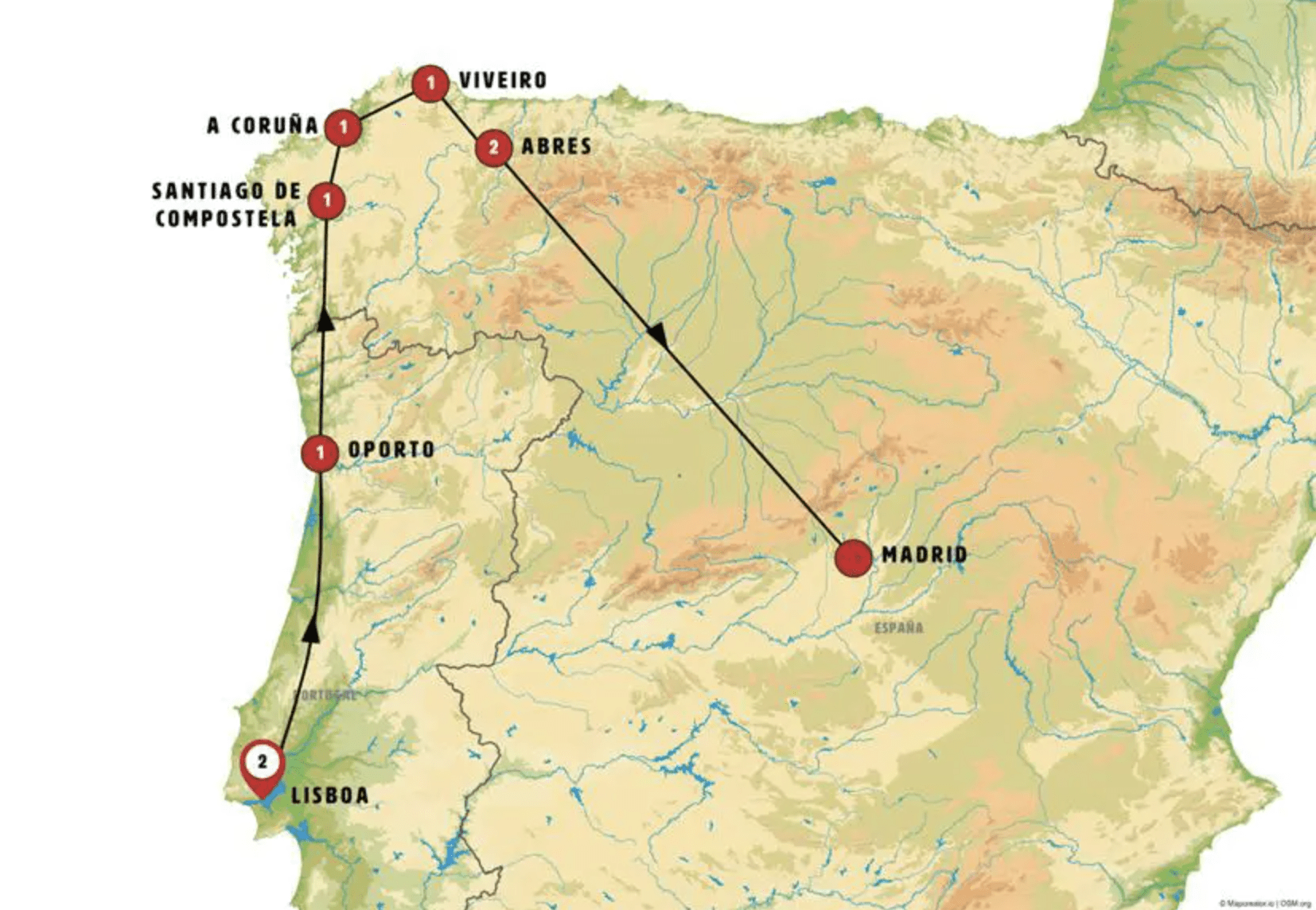 Recorrido: -> Lisboa 2 -> Oporto 1 -> Santiago De Compostela 1 -> A Coruña 1 -> Viveiro 1 -> Abres 2 -> Madrid