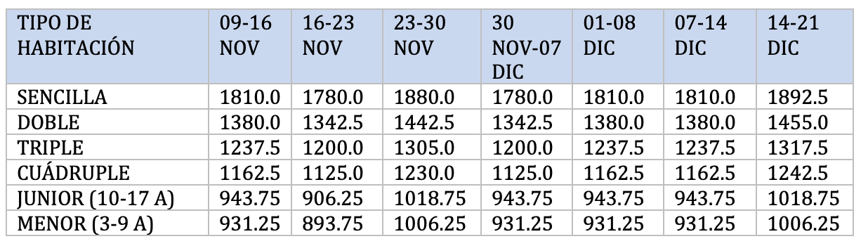 - Precios por persona, sujetos a disponibilidad de fechas y cambios sin previo aviso.