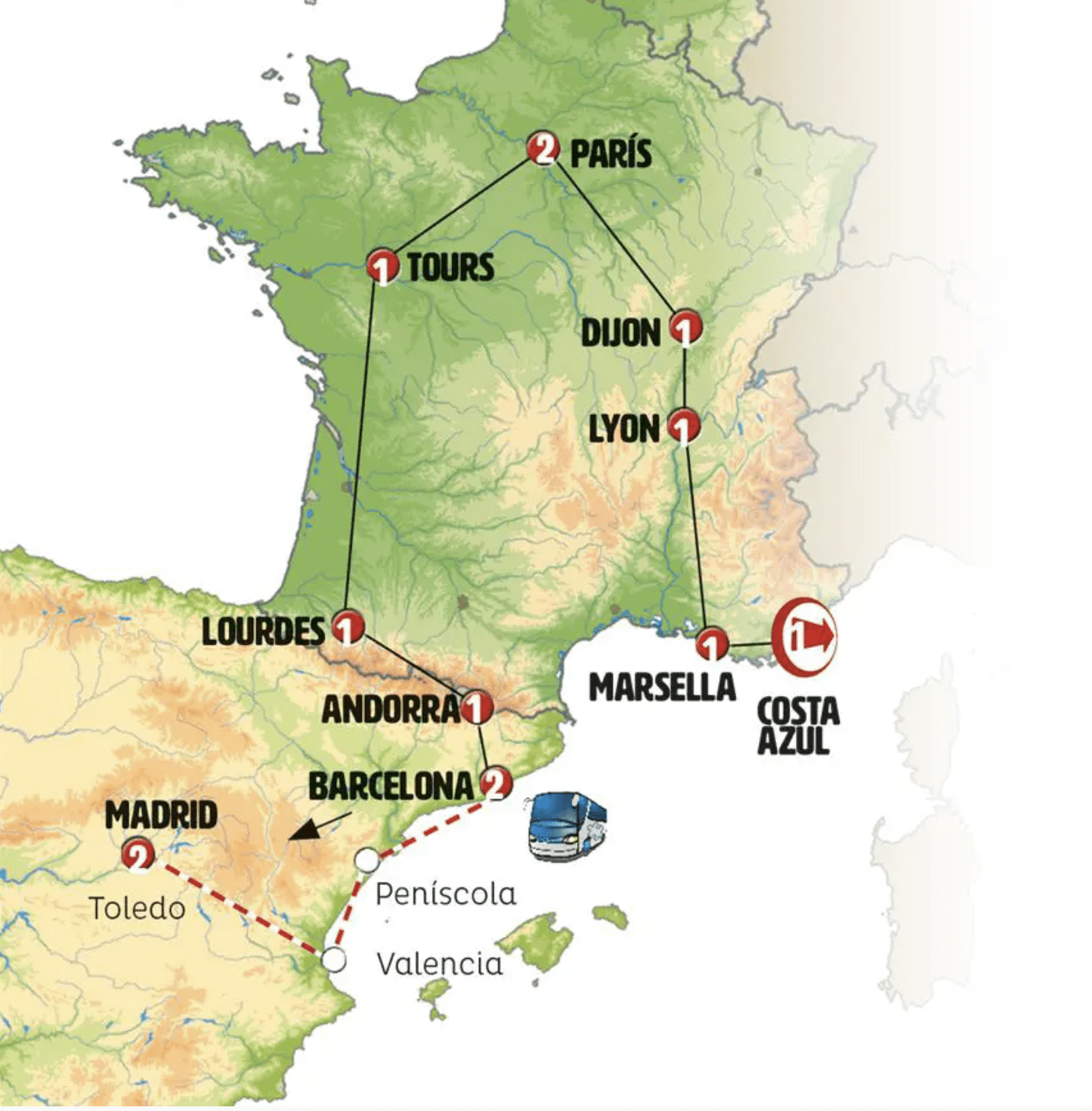 Recorrido: -> Costa Azul 1 -> Marsella 1 -> Lyon 1 -> Dijon 1 -> París 2 -> Tours 1 -> Lourdes 1 -> Andorra 1 -> Barcelona 2 -> Madrid 2