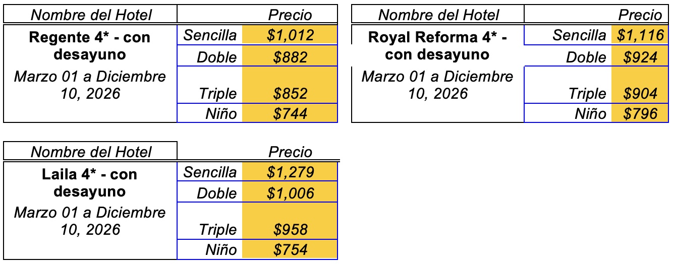 • Precios por persona, sujetos a disponibilidad de fechas y cambios sin previo aviso.
