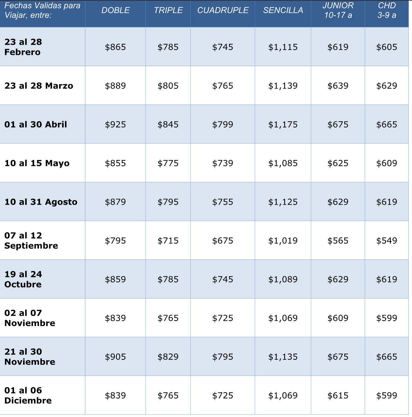 - Precios por persona, sujetos a disponibilidad de fechas y cambios sin previo aviso.